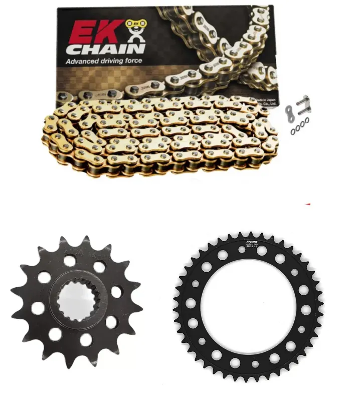 - Especificaciones técnicas: Piñón: 16 dientes engomado, Corona: 42 dientes, Cadena: D.I.D. X-Ring 525 ZVMX2 116 pasos