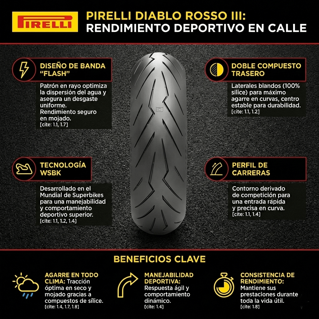 El DIABLO ROSSO™ III en medida 190/55 es la elección definitiva para los pilotos de Superbikes que buscan un comportamiento deportivo sin compromisos en carretera. Su diseño y estructura han sido optimizados para gestionar el torque de las motos más potentes, ofreciendo una estabilidad excepcional en aceleración y una precisión milimétrica en curvas.